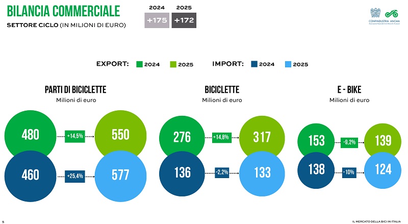 BILANCIA COMMERCIALE E COMPONENTISTICA: EQUILIBRIO E DINAMISMO – Nel complesso, la bilancia commerciale del settore ciclo rimane positiva e sostanzialmente allineata all’anno precedente, attestandosi a +172 milioni di euro, contro i +175 milioni del 2024. Un risultato che conferma comunque una certa capacità competitiva della filiera italiana, anche in una fase di mercato ancora debole e disomogenea. A sostenere il profilo industriale del comparto contribuisce anche la dinamica della componentistica: nel 2025 l’export di parti di biciclette cresce a 550 milioni di euro (+14,5%), mentre l’import sale a 577 milioni (+25,4%). Si tratta di numeri che segnalano, da un lato, una filiera produttiva ancora reattiva e, dall’altro, un contesto competitivo che impone molta attenzione a margini, posizionamento e politiche di mercato.