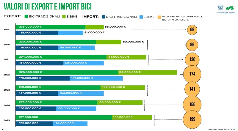 INDUSTRIA: LA FILIERA DELLE BICICLETTE TRADIZIONALI MOSTRA RESILIENZA – Sul fronte industriale, il 2025 mostra invece segnali timidamente più favorevoli per il comparto delle biciclette tradizionali. La produzione sale a 1.805.000 unità (+6%), l’export raggiunge 1.042.000 pezzi (+11%), mentre l’import si riduce a 284.000 unità (-28%). Anche in valore, le esportazioni di biciclette crescono da 276 a 317 milioni di euro (+14,8%), mentre l’import scende da 136 a 133 milioni (-2,2%).