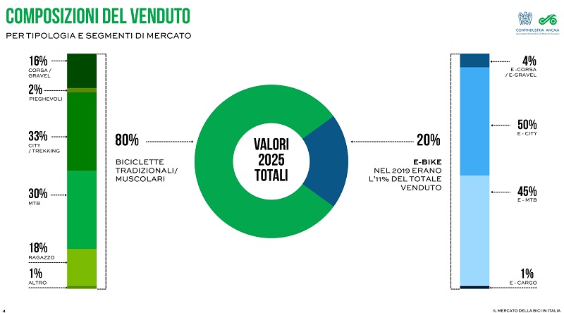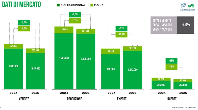 Il mercato italiano della bicicletta archivia il 2025 con un nuovo segno negativo, confermando la fase di difficolta già emersa negli ultimi anni. Secondo i dati elaborati da Confindustria ANCMA (Associazione Nazionale Ciclo Motociclo Accessori) presentati stamane allo stabilimento Pirelli di Bollate (MI), le vendite complessive di biciclette ed e-bike si attestano a 1.303.000 unità, in calo del 4% rispetto al 2024. Nel dettaglio, le biciclette tradizionali scendono a 1.047.000 pezzi (-3%), mentre le e-bike si fermano a 256.000 unità (-7%).