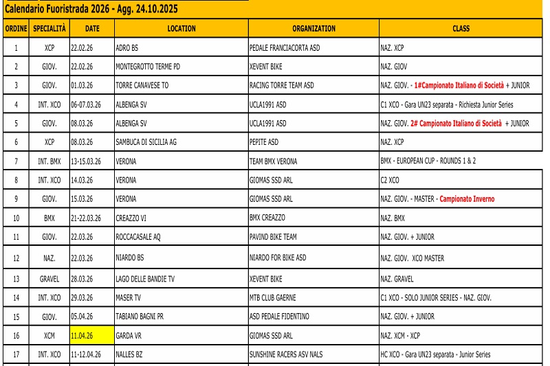 Pronta una prima bozza del calendario 2026 della Fci per il fuoristrada con già 99 date tra XC , DH, Gravel e Marathon nazionali e internazionali.