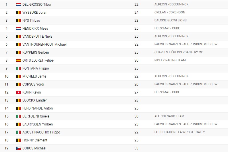 Del Grosso va a conquistare la 2^ vittoria di stagione, precedendo Wiseure e un Thibau Nys che dopo aver raggiunto e superato il fuggitivo alza bandiera bianca in seguito ad una brutta caduta (dove convolge anche Wyseure) e perde secondi e posizioni. Giù dal podio Hendrickx, Vandeputte e uno strepitoso Vanthourenhout, caduto in partenza e ripartito dall’ultima posizione. Tre italiani nella Top20, ovvero Filippo Fontana 9°, Gioele Bertolini 15° e Filippo Agostinacchio 17°.