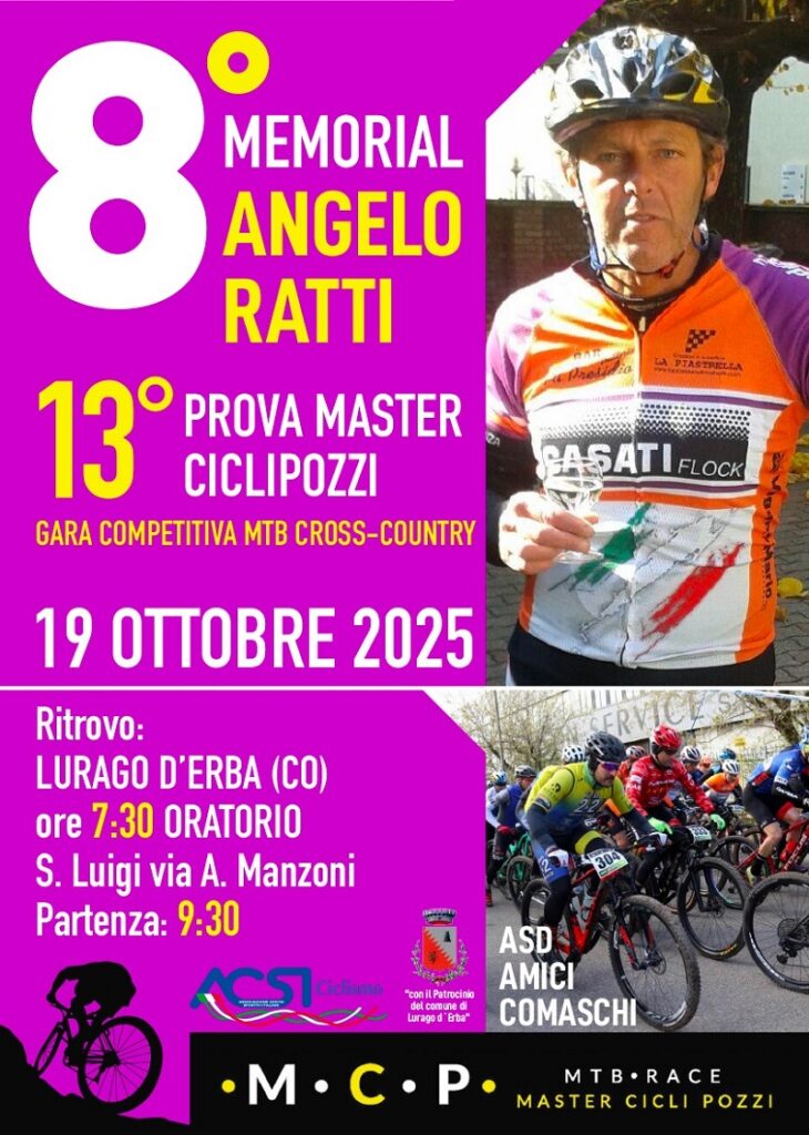 Il 23 marzo era in calendario il memorial Ratti, manifestazione non disputata causa il maltempo, con gli organizzatori costretti a rimandare l’evento, e che sarà recuperato domenica 19 ottobre. Giunto alla sua ottava edizione, il memorial Angelo Ratti aspetta a Lurago D’Erba (Co), un buon numero di partecipanti, per salutare l’edizione del 2025 del Master Cicli Pozzi di mountain bike. La località luraghese, quindi, avrà il piacere di chiudere la stagione off road dell’Acsi di Como- Lecco. Un tracciato tecnico di un percorso che toccherà anche i comuni di Alzate Brianza ed Inverigo. Un forte ringraziamento va speso per la locale amministrazione comunale di Lurago d’Erba che ha dato il suo patrocinio all’importante gara inserita nel calendario dell’Acsi di Como-Lecco. In cabina di regia il Gruppo Amici Comaschi. Tutte le indicazioni della gara sono ben visibili sulla locandina allegata.