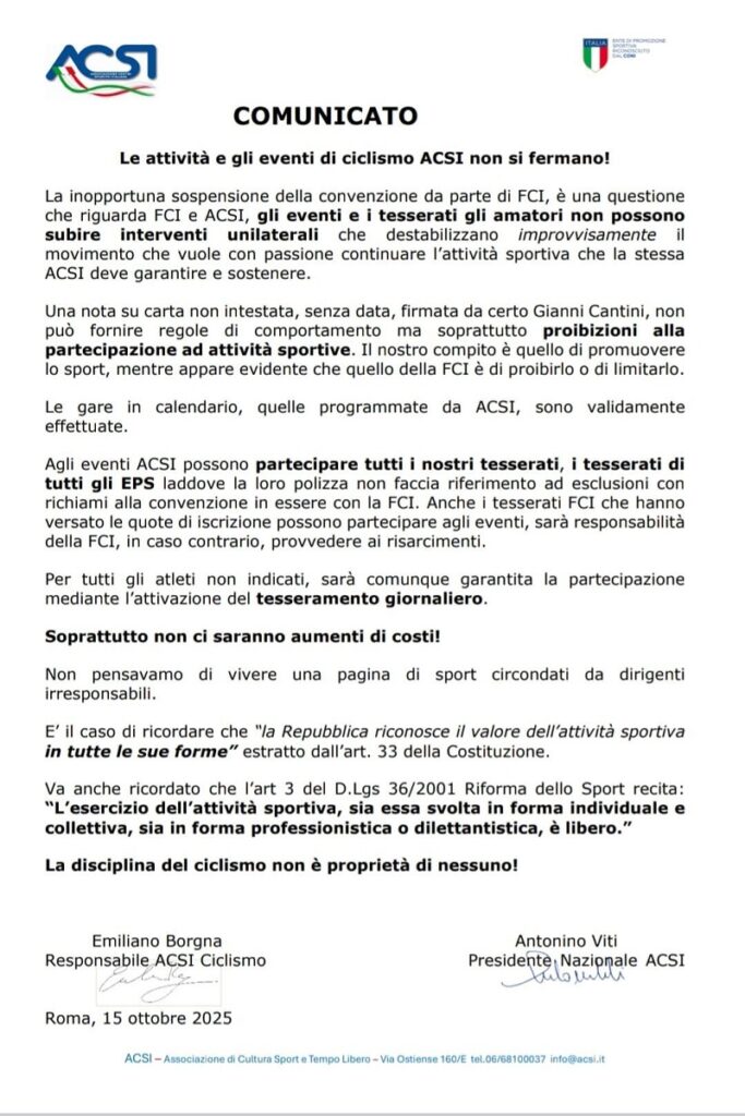 Per par condicio pubblichiamo il comunicato stampa della Acsi nazionale. La questione si fa spinosa nell’immediato per le ultime granfondo strada e mtb della stagione 2025, oltre che ovviamente per la stagione del ciclocross. In particolare non è ancora chiaro come e se potranno partecipare di qui al 31.12.25 i tesserati Fci alle gare organizzate come Acsi.