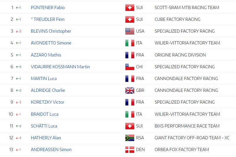 E si parte subito da una sorpresa, rappresentata dal neo acquisto del team Scott-Sram Fabio Puntener, che è ora il nuovo “re” dell’XCO. Scalzato Blevins, sopravanzato anche da Finn Treudler, che da Under 23 si piazza sul 2° gradino del podio. Sale anche Avondetto, ora al 4° posto. Poi Azzaro, Vidaurre, Martin, Aldridge e Koretzky, che perde ben 5 posizioni. 10° Luca Braidot. 12° Hatherly, nonostante la conferma del titolo iridato. Per gli altri italiani, 26° Juri Zanotti e 39° Filippo Fontana.