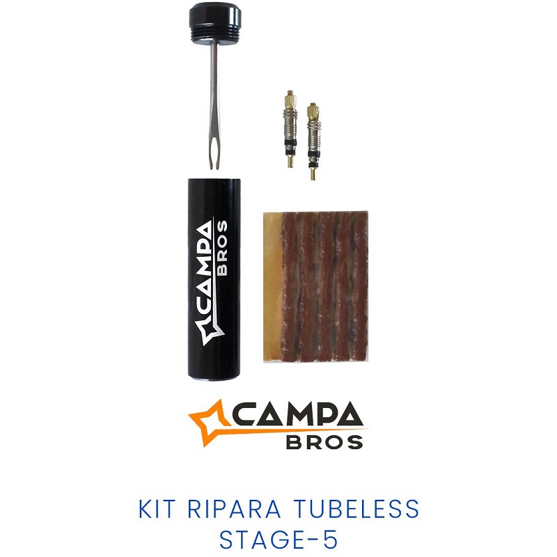 Kit ripara tubeless Stage-5 di Campa Bros è un prezioso alleato per la riparazione rapida delle coperture tubeless. La leggera, compatta e resistente custodia in alluminio facilita la portabilità e contiene 5 tappi da 3,5 x 50 mm, oltre all’utensile per l’inserimento. Sono incluse nella confezione 2 anime per valvola Presta.