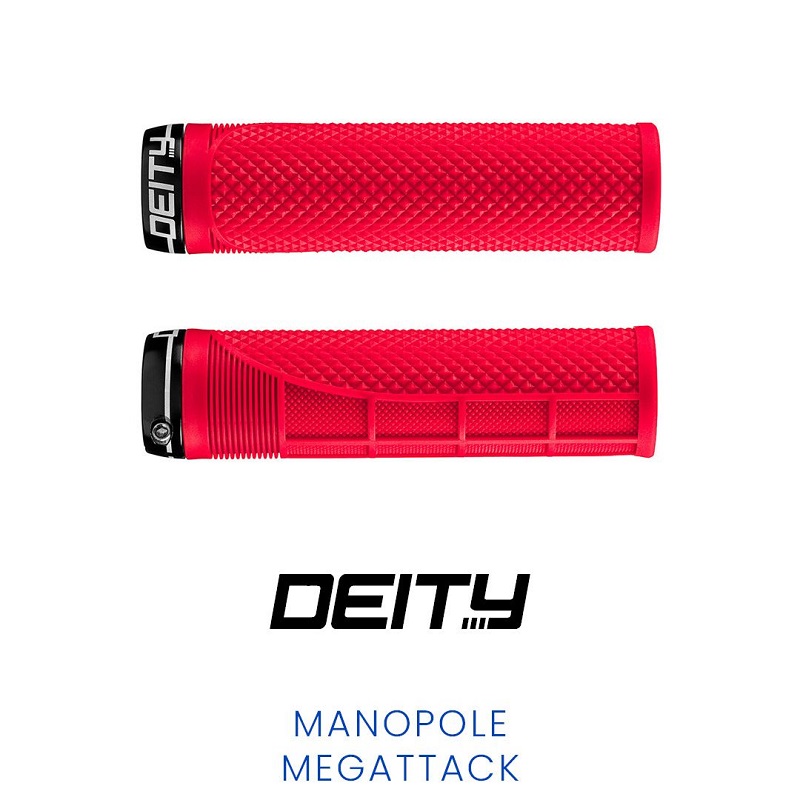 Le manopole Deity Megattack combinano gli elementi di Lockjaw, Knuckleduster e Supracush in una manopola tecnica extra large. Con diametro da 36 mm e lunghezza di 140 mm, offrono una presa salda, un controllo superiore e più spazio per mani grandi. Il design ergonomico riduce il carico articolare e aumenta il comfort anche nelle lunghe uscite.