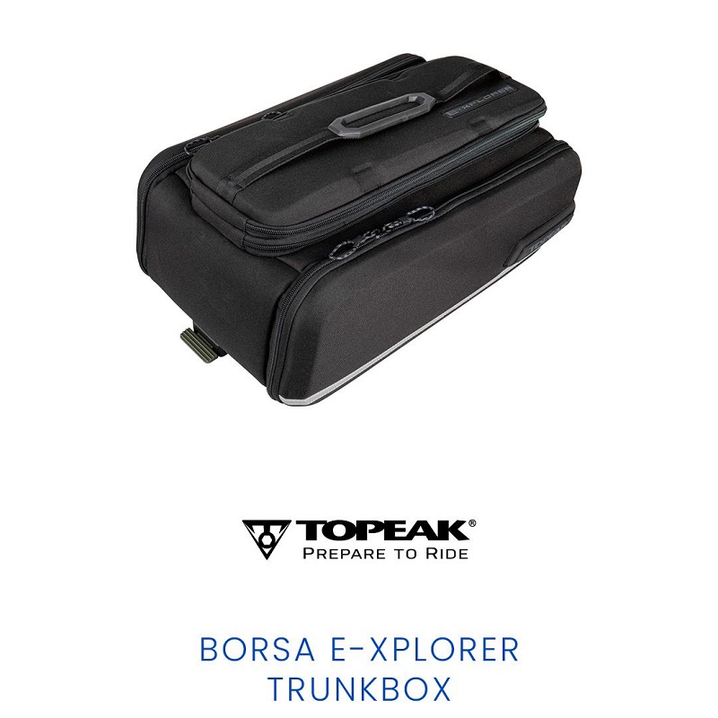 L’E-Xplorer TrunkBox è un portabatteria per E-bike robusto e impermeabile, con imbottitura rigida antiurto e vano superiore espandibile per massimizzare la capacità. Compatibile con Topeak QuickTrack® 2.0, offre fissaggio sicuro della batteria, dettagli riflettenti e spazio extra per gli oggetti essenziali.