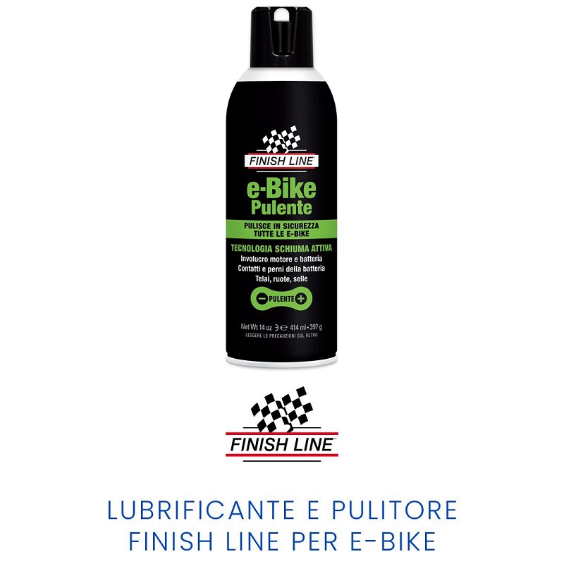 Il pulente e-Bike Finish Line rimuove efficacemente lo sporco senza rischi per i componenti elettrici, grazie a una formula leggera, non corrosiva e che non graffia.